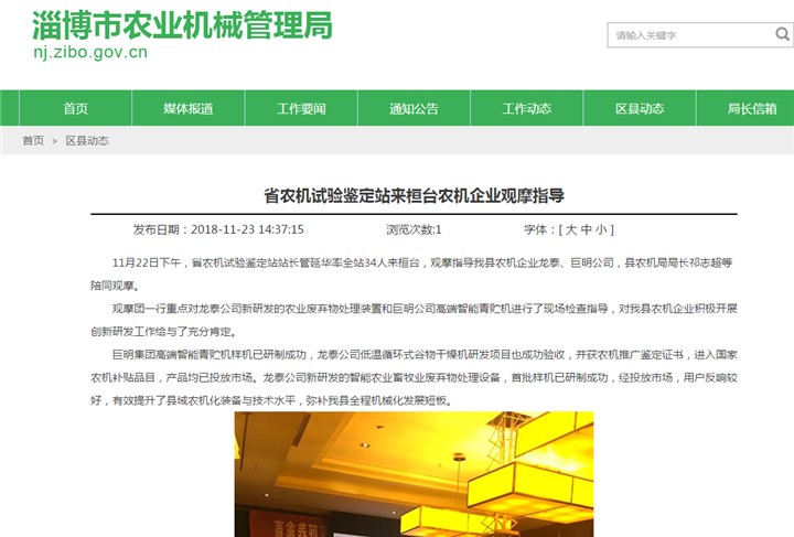 2018年11月(yuè)22日山東省農機鑒定站、淄博市農業機械管理局來我公司山東91福利网機械考察,觀摩團一行對我公司新研發的有機廢氣物好氧發酵裝(zhuāng)置進行了現場檢查指導,對我公司的(de)工(gōng)作給與了充分的肯定。