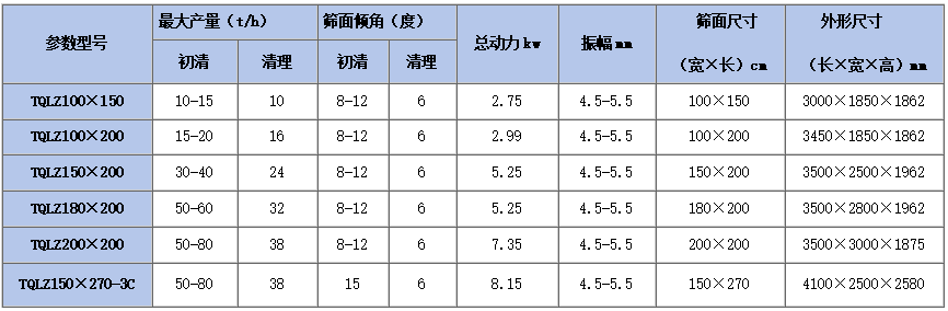 TQLZ係列循環振動清理篩適用於小麥、玉米(mǐ)、大(dà)豆、糧庫、酒廠原糧、食用油(yóu)廠原糧(liáng)的初清,對糧食中的大、中、小雜物進行篩(shāi)理、分離。該(gāi)設備采振動電機、減震橡膠彈簧等優選零部件,具有噪音低、運轉平穩、處(chù)理量大(dà)、能(néng)耗低,清理效(xiào)果(guǒ)佳(jiā)、整機封閉無灰塵外揚等特點,篩體角度及振幅可調(diào)整。